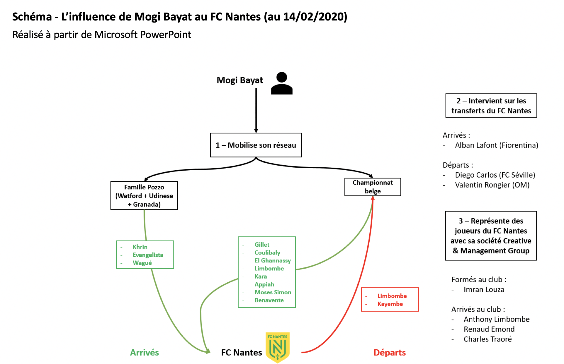 Selon les propos d’un proche de l’agent recueillis par Nicolas Fradin pour le site enlucarne.com, Mogi Bayat se serait immiscé dans les transferts du FC Nantes en décembre 2015. Il aurait contribué au transfert de Guillaume Gillet en provenance d’Anderlecht et potentiellement fait un geste sur les commissions du transfert. Malgré son implication dans ce transfert, l’intermédiaire franco-iranien ne semble pas immédiatement avoir un impact sur le recrutement du club. En effet, le FC Nantes décide dans un premier temps de faire confiance à sa cellule de recrutement composée de Williame Ayache et Olivier Monterrubio. Un changement d’entraîneur lors de la saison 2016/2017 va cependant changer la donne. Le club engage Sergio Conceiçao et lui donne les pleins pouvoirs. Ce dernier va utiliser le réseau Doyen Sports, qui représente ses intérêts, pour amener de nouveaux joueurs. Début juin 2017, Conceiçao quitte le club pour s’engager à Porto. Ayant perdu à la fois une partie de sa cellule de recrutement et le réseau Doyen Sports, le FC Nantes est dans l’impasse. C’est suite à cela que Mogi Bayat va refaire son apparition en faisant venir Kalifa Coulibaly et Yassine El Ghanassy dans le dernier jour du mercato. Ces transferts montrent bien la méthode Bayat et peuvent être interprétés comme le fameux service que le FC Nantes devait en retour à l’agent. El Ghanassy était par exemple un joueur remplaçant à Ostende avec un salaire très élevé. En raison de sa rémunération et de son statut, son club devait absolument le vendre. Il était néanmoins compliqué voire impossible de le transférer car le joueur rejetait toutes les offres des clubs intéressés qui promettaient un salaire à la baisse. L’intervention de Bayat s’est donc révélée cruciale sur ce dossier. Lors des saisons suivantes, le propriétaire de la société Creative & Management Group continue d’étendre son influence sur les bords de l’Erdre. Outre l’arrivée de joueurs faisant partie de son réseau, l’agent va également prendre part au transfert de Valentin Rongier du FC Nantes vers l’Olympique de Marseille. Ce serait également lui qui aurait permis de vendre Diego Carlos au FC Séville pour 15 millions d’euros quand d’autres clubs n’en proposaient que 10. Il s’agit là d’un véritable coup de force pour celui qui s’est auparavant heurté à des clubs comme le FC Porto, refusant de faire des affaires avec lui. Enfin, un dernier point illustre la montée en puissance de l’intermédiaire au FC Nantes. Actuellement, sa société Creative & Management Group représente les intérêts de quatre joueurs de l’effectif nantais. Jusque-là rien de surprenant, étant donné qu’une partie de ces joueurs comme Renaud Emond ou Anthony Limbombe sont déjà passés par son réseau. Seulement, ce n’est pas le cas pour deux d’entre eux. Par exemple, Charles Traoré qui, au moment de son arrivée à Nantes, était représenté par Bakary Sanogo. On y retrouve également Imran Louza, âgé de vingt ans et véritable révélation chez les canaris cette saison. De ce constat découle deux hypothèses. Premièrement, ses activités au sein du club semblent lui permettre d’agrandir son portefeuille de joueurs et son réseau. Mais au-delà de cela, l’agent réputé pour vendre cher des joueurs dits « moyens » pourrait viser un cran plus haut. En enrôlant Imran Louza, joueur côté à 6 millions d’euros par Transfermarkt avant même d’avoir effectué une première saison complète en Ligue 1, Bayat pourra potentiellement intervenir sur des dossiers plus conséquents et négocier avec de plus gros clubs.