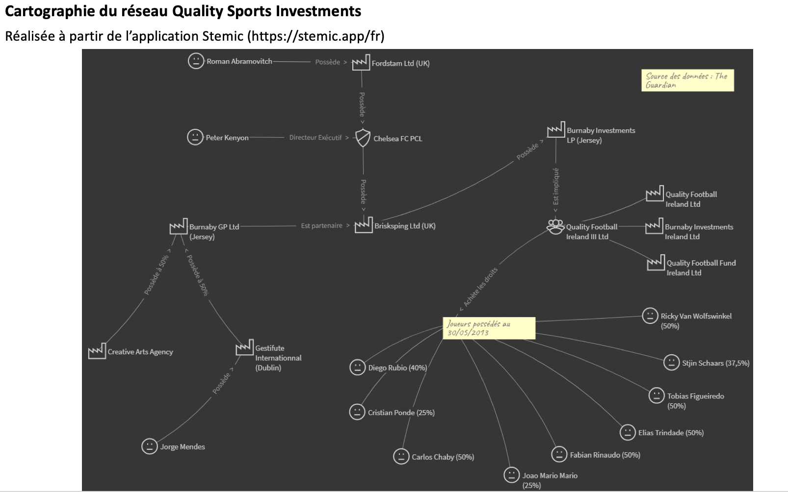 Jorge Mendes est un agent particulièrement habile pour toucher des commissions sur les salaires et transferts de ses joueurs, mais il ne s’arrête pas là. Il a également su tirer profit de la TPO lorsqu’elle était autorisée. Selon The Guardian, il est à l’origine de la création de Quality Sports Investments avec Peter Kenyon, directeur exécutif de Chelsea FC à l’époque. QSI est un réseau regroupant une multitude d’entreprises dédiées à l’acquisition des droits économiques de joueurs (voir le schéma ci-dessous). Bien que son fonctionnement soit complexe à décrire, il est possible de le résumer en 3 étapes. Dans un premier temps, une entreprise va investir dans Quality Sports Investments. L’une des sociétés de ce réseau va ensuite émettre un “ERPA” (Economic Right Participation Agreement). Cet ERPA va permettre au groupe Quality Football Ireland III Ltd d’acquérir une partie des droits économiques d’un joueur. La dernière étape consiste à revendre le joueur dans un championnat interdisant la tierce propriété. En procédant ainsi, QSI s’assure que ses parts soient vendues car le club acheteur sera dans l’obligation d’acquérir l’ensemble des droits économiques du joueur. L’ensemble de ce montage financier a été pensé pour optimiser les plus-values effectuées, y compris sur le plan fiscal car la majorité de ces sociétés ont leur siège social en Irlande ou à Jersey. Notons que la présence de Peter Kenyon dans ce système n’est guère surprenante et illustre parfaitement les liens que Jorge Mendes peut entretenir avec les différents acteurs du football. Les deux hommes ont déjà collaboré par le passé lorsque Peter Kenyon était le directeur exécutif de Manchester United. En effet, l’agent représentait le joueur star de l’équipe à savoir Cristiano Ronaldo. Il a également fait venir des joueurs de son réseau comme Nani, Anderson ou bien Bébé. Courtisé par Roman Abramovitch, le propriétaire de Chelsea, Peter Kenyon prend ensuite la décision de rejoindre le club londonien. Un an plus tard, le dirigeant réalise un grand coup en enrôlant José Mourinho, prestigieux entraîneur venant de remporter la Ligue des Champions avec le FC Porto et représenté par… la Gestifute. Les deux hommes semblent donc particulièrement proches en affaires et comme supposé par The Guardian, l’implication du dirigeant britannique dans Quality Sports Investments ne serait qu’un service rendu à l’agent pour avoir la priorité sur les joueurs de son réseau.