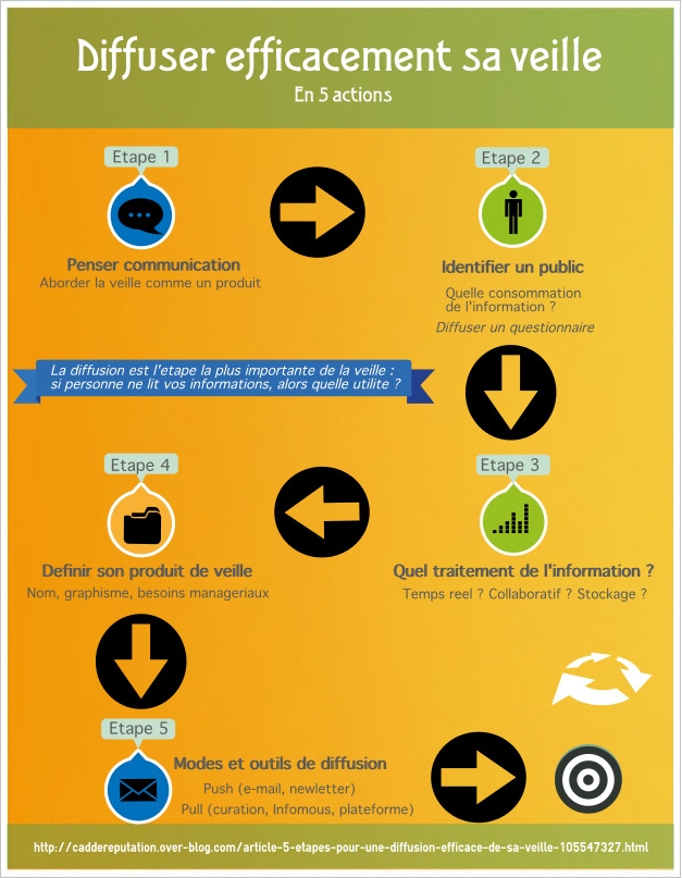 Pour aider à la réflexion et assurer une diffusion efficace des résultats de la veille, Camille ALLOING, chercheur R&D en innovations numériques, a déterminé cinq phases dans son article « 5 étapes pour une diffusion efficace de sa veille« .