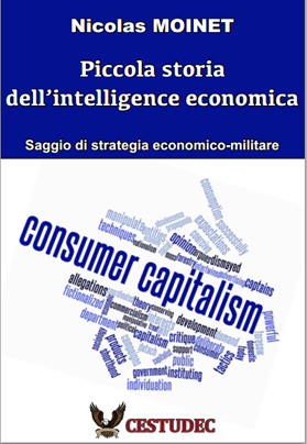 L’ouvrage de Nicolas MOINET est publié en Italie par le CESTUDEC (Centre Études Stratégique Carlo de Cristoforis). Cette association italienne à but non lucratif a pour vocation de promouvoir la connaissance de l’histoire militaire et des sciences stratégiques internationales. Il s’agit là d’une première comme l’indique la présentation en italien : « IL Cestudec ha il piacere di presentare per la prima volta al lettore italiano il saggio di Nicolas Moinet sulla storia della intelligence economica in Francia alla quale ha indubbiamente contribuito in modo determinante Christian Harbulot attuale direttore della Scuola di guerra economica di Parigi. L’autore del saggio è certamente uno dei più autorevoli interpreti della intelligence economica francese in qualità di responsabile del Master di Intelligence Economica e Comunicazione Strategica presso l’Icomtec , di ricercatore del Cerege, di responsabile dell’equipe di Intelligence economica dello stesso istituto sia infine in qualità di Ricercatore associato presso l’Istituto di Scienze della Comunicazione del Cnrs. »