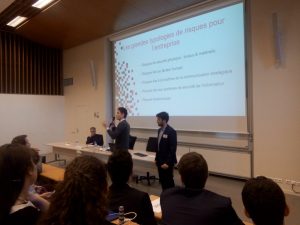 - La Sécurité économique : Le risque pour une entreprise se caractérise selon plusieurs critères : la sécurité physique, le facteur humain, la maîtrise de la communication stratégique ou encore le système informatique. La présentation de ce dernier point s’est focalisé sur un outil d’auto-diagnostique que les étudiants en charge du projet ont eux mêmes élaboré. Cet outil a été salué par Alain Juillet et Nicolas Moinet.