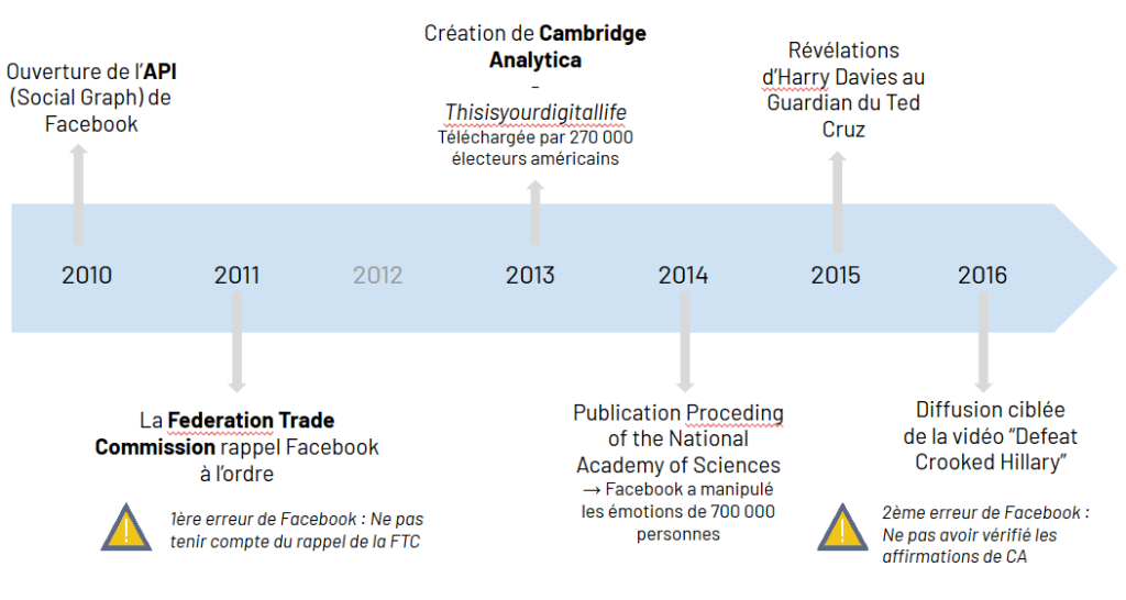 Il faut remonter à 2010 pour retrouver l’ouverture de l’API (Application Programming Interface ou Interface de programmation) de Facebook qui permet la collecte de données. La Federal Trade Commission (FTC) est une agence indépendante du gouvernement des États-Unis, dont la mission principale est l’application du droit de la consommation et le contrôle des pratiques commerciales anticoncurrentielles. Dès 2011, elle réagit en rappelant Facebook à l’ordre sur le manque d’information et de choix proposé à ses utilisateurs en termes de gestion du partage de leurs données personnelles. Rappel à l’ordre qui semble être largement minimisé par le réseau social. Cambridge Analytica, créé en 2013 s’appuie sur l’API de Facebook pour récolter des données. L’application « This is your digital life », aura par exemple été téléchargée au total par plus de 270 000 personnes.